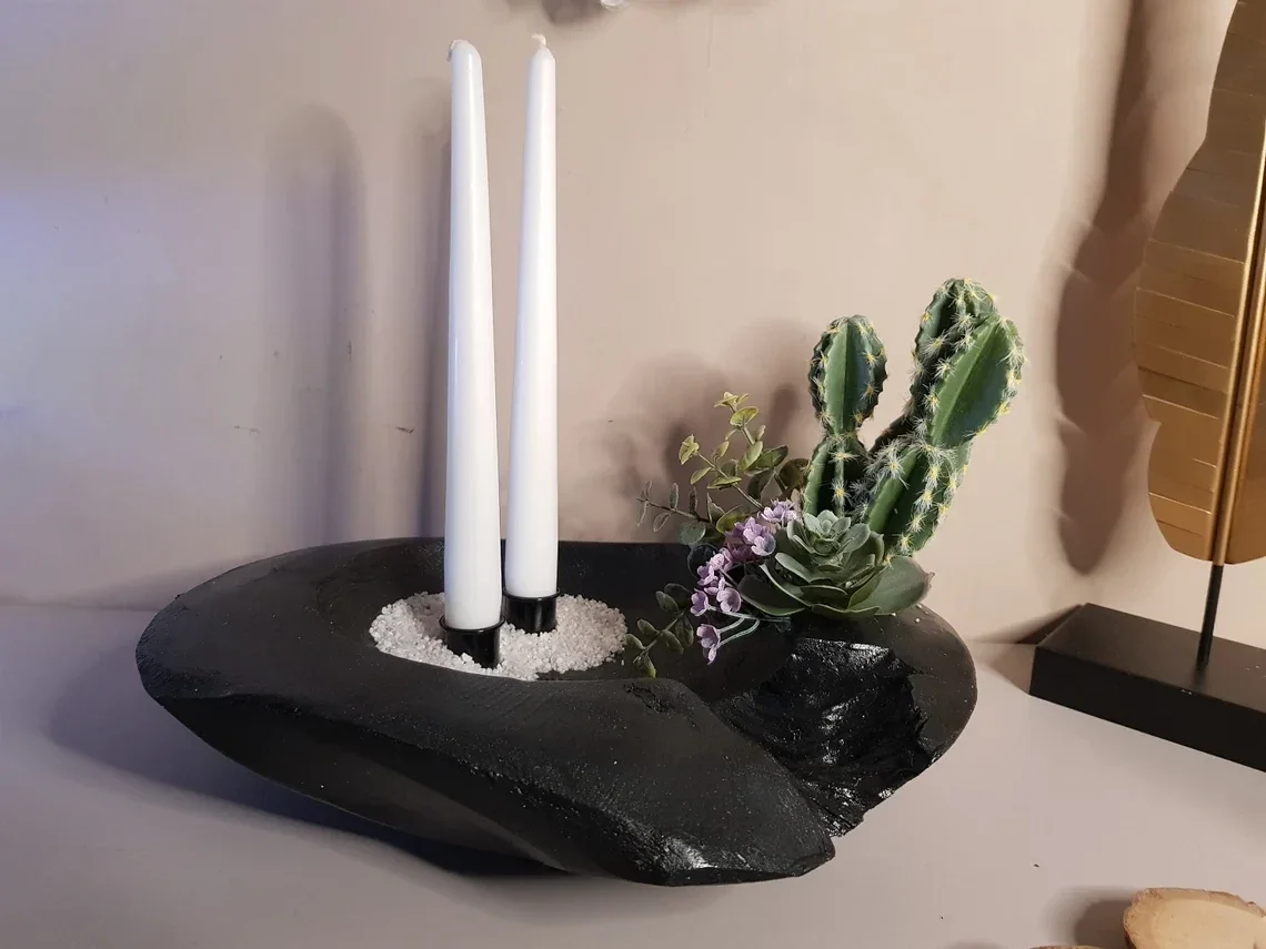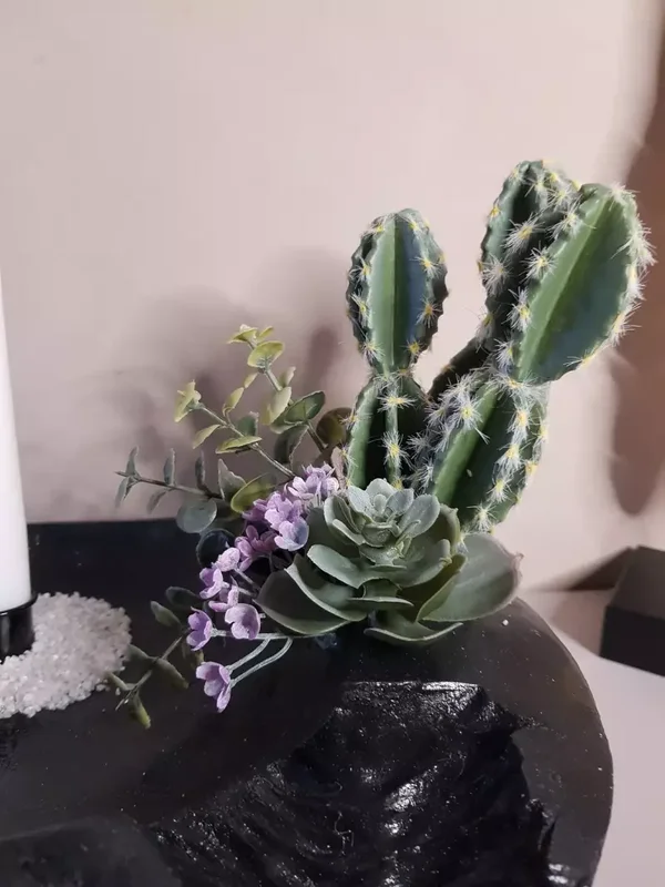 D'une allure contemporaine, ce bougeoir est en bois peint et verni il comprend deux bougies sur socle en métal noir, un décor de cactus très réaliste donne une touche de modernité à cette décoration