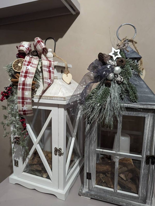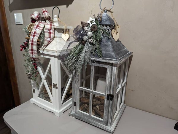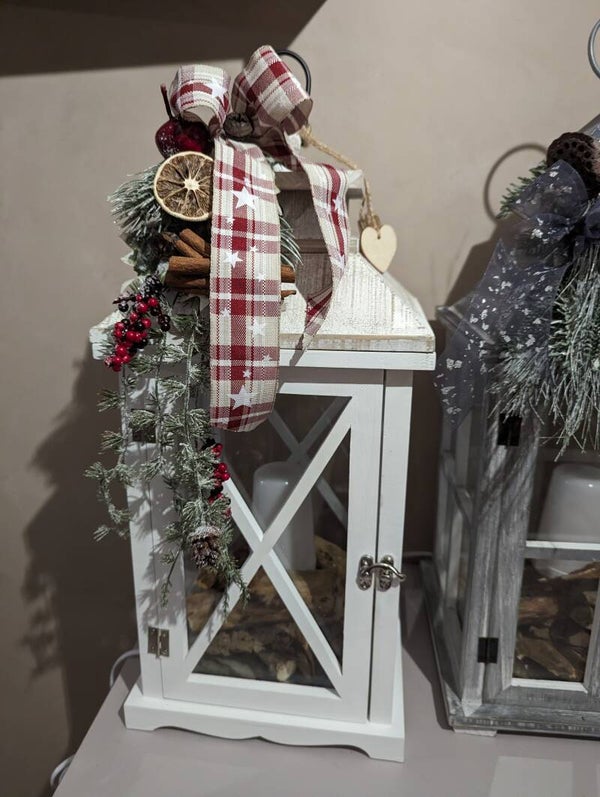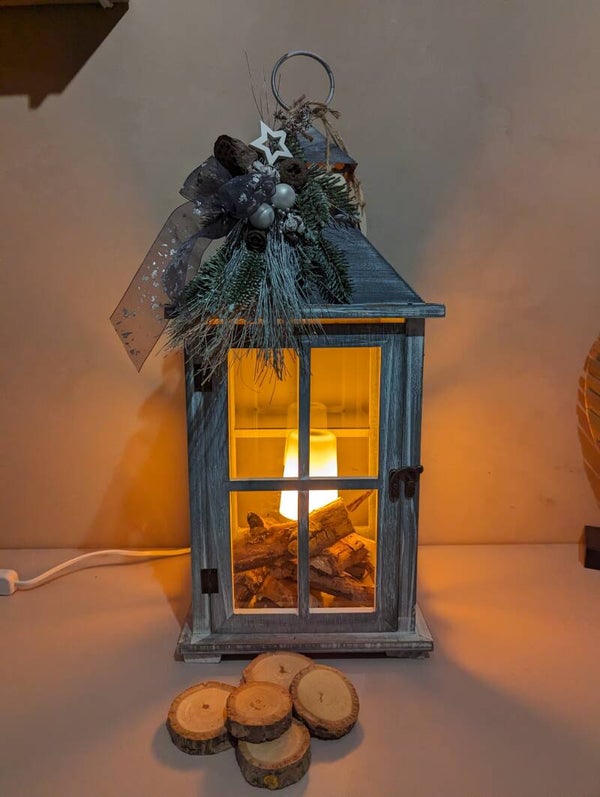 Lanterne en bois et verre. décor de Noël amovible pour pouvoir profiter de cette lanterne toute l'année, ampoule a effet cheminée, entouré de bois pour un effet réaliste. La déco de Noël avec sapin et ruban et quelques éléments de Noël est amovible ainsi vous profiterez de cette lanterne toute l'année.