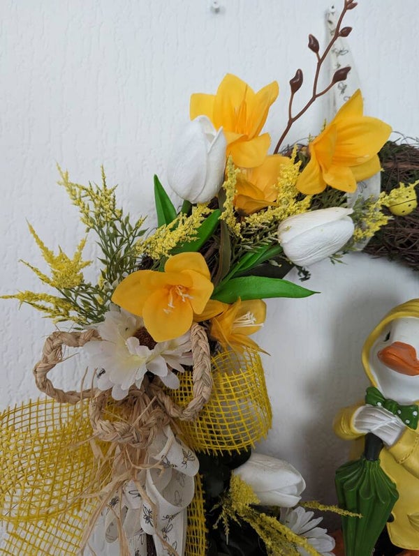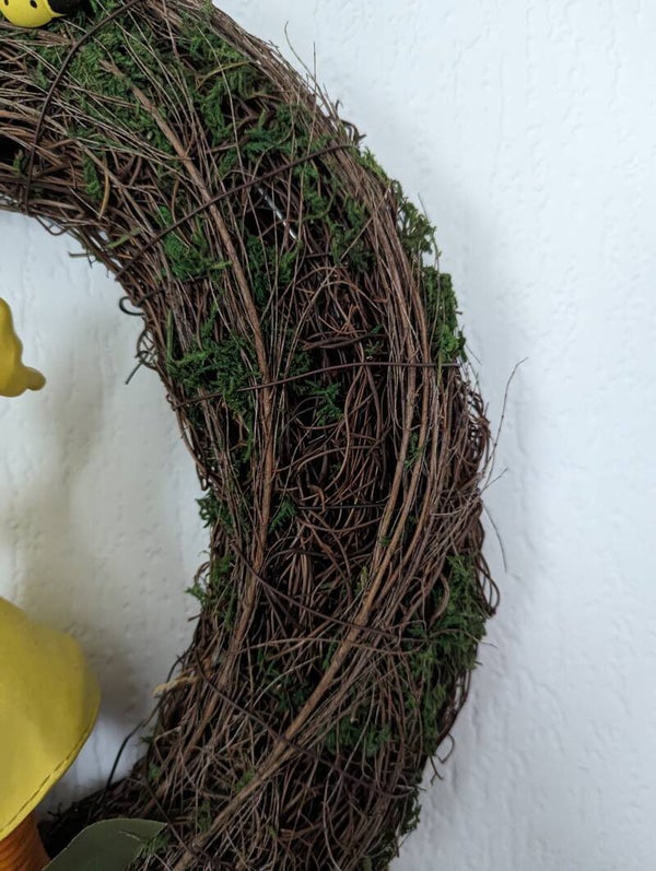 Décoration de pâques sur couronne de brindille et mousse, canard en poly résine , fleurs artificielles, ruban en jute et ruban imprimé abeilles, raphia, coccinelles en bois,