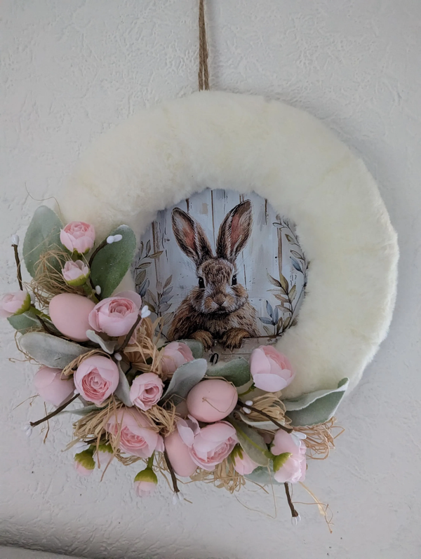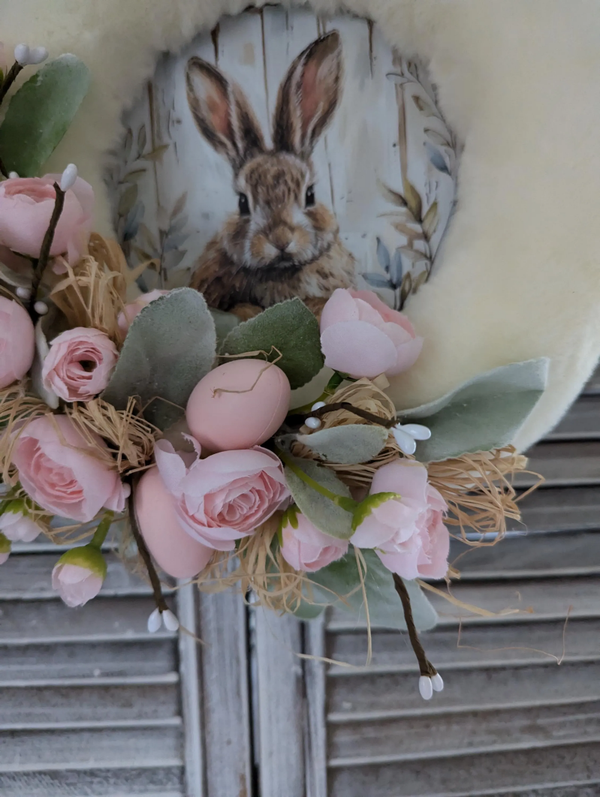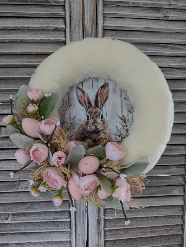 Couronne de fourrure de 27 cm de diamètre, fleurs artificielles, feuillage artificiel, œufs, cordon d'attache.