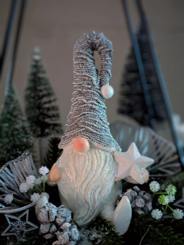 Décoration de Noël artisanale et unique, idéale pour embellir votre intérieur pendant les fêtes de fin d'année. Avec son petit gnome , cet arrangement ajoute une note festive et conviviale.