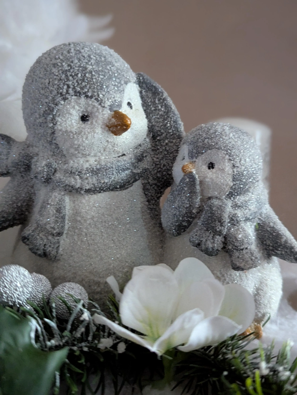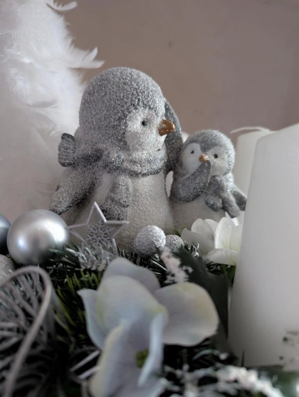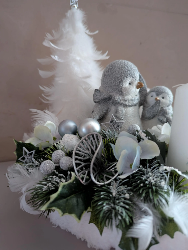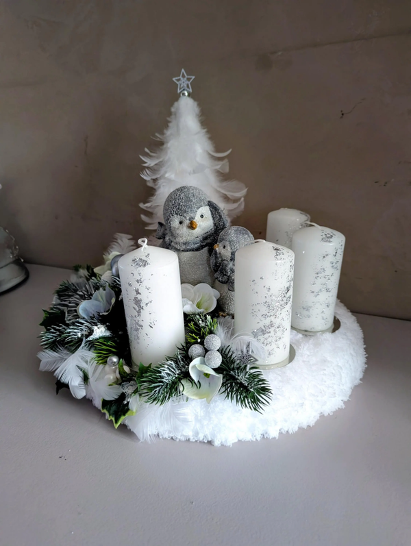 Couronne de l'Avent artisanale et unique, parfaite pour décorer votre intérieur durant les fêtes de fin d'année. Avec ces deux pingouins, cet arrangement apporte une touche festive et chaleureuse.