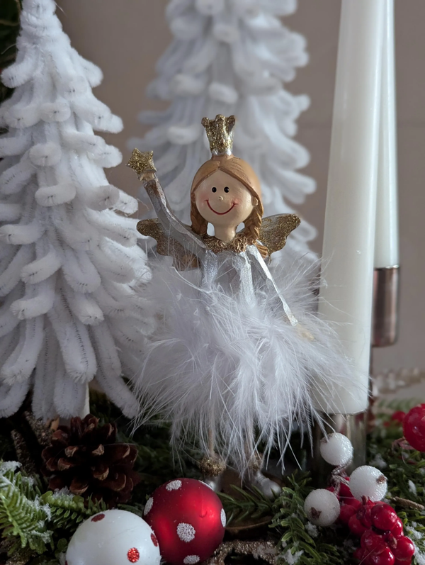 Décoration de noël artisanale et unique, parfaite pour décorer votre intérieur durant les fêtes de fin d'année. Avec son ange, cet arrangement apporte une touche festive et chaleureuse.
