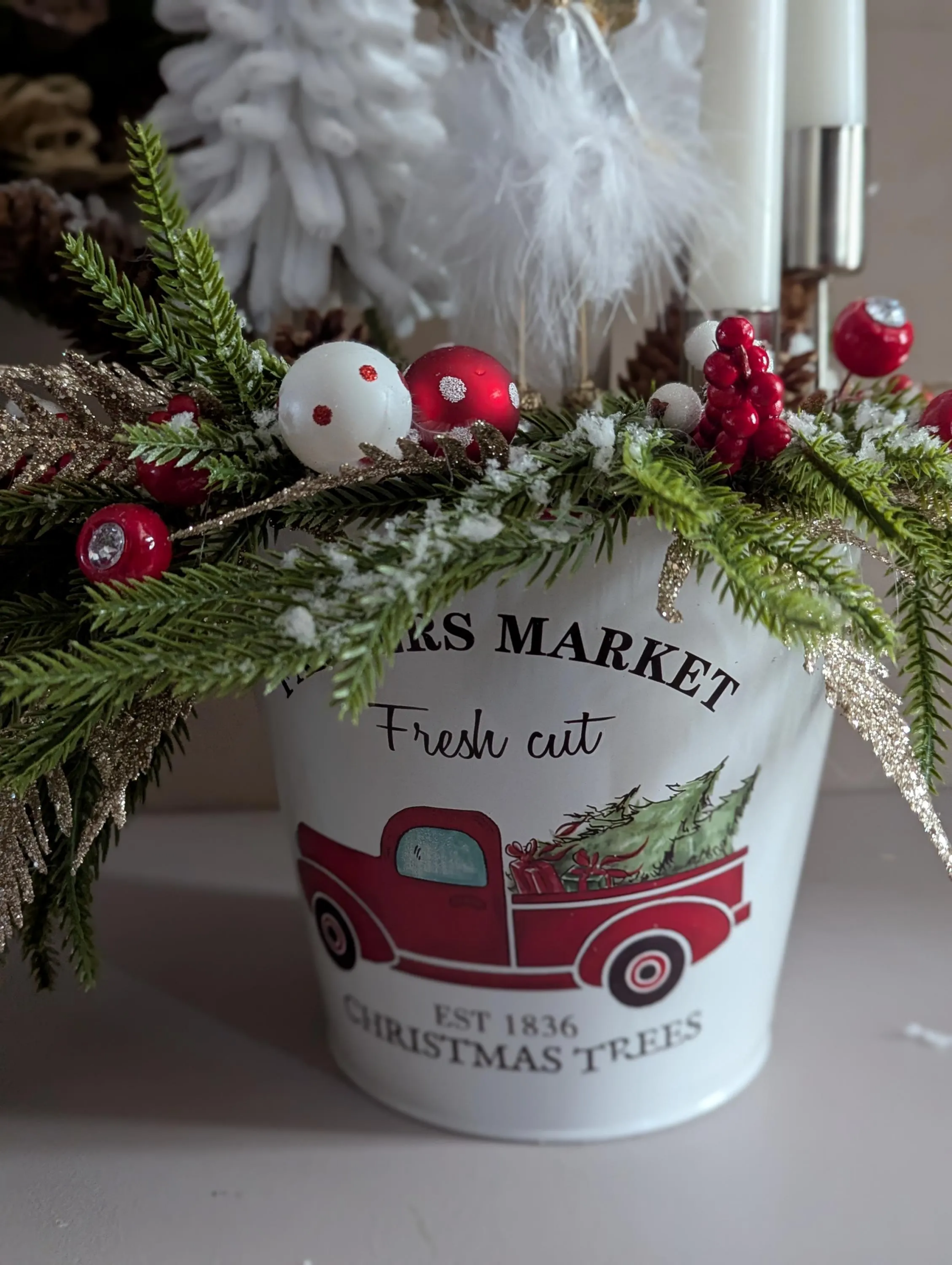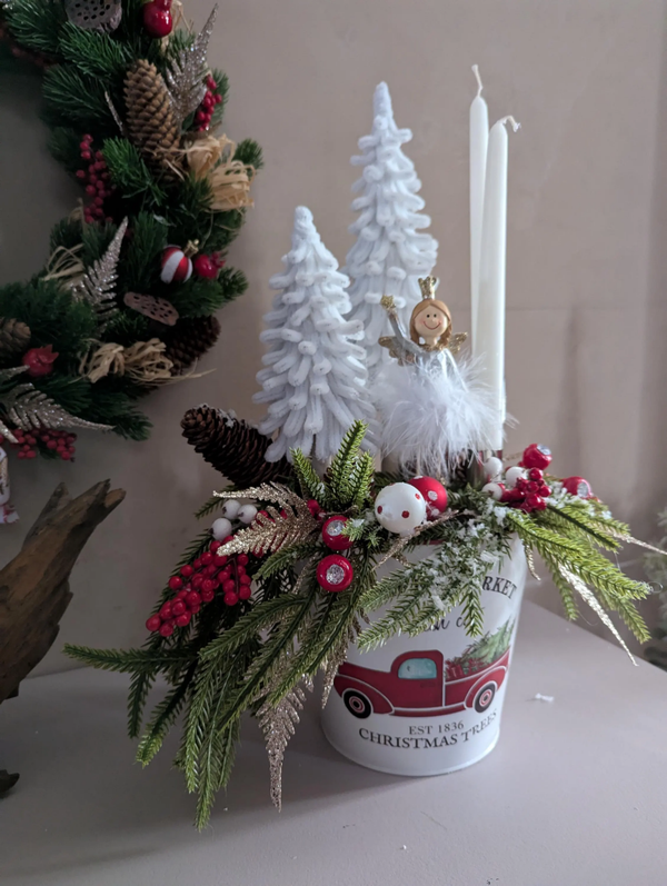 Elle est composée d'un seau en métal, décoré avec des boules de Noël, des baies blanches artificielles, un ange blanc et doré, deux grands sapins blancs faits main, des baies rouges scintillantes, des pommes de pin, du sapin artificiel, des grappes de baies rouges, du feuillage doré, ainsi que deux supports à bougies avec leurs bougies. Dimensions : environ 35 cm de longueur et 49 cm de hauteur.
