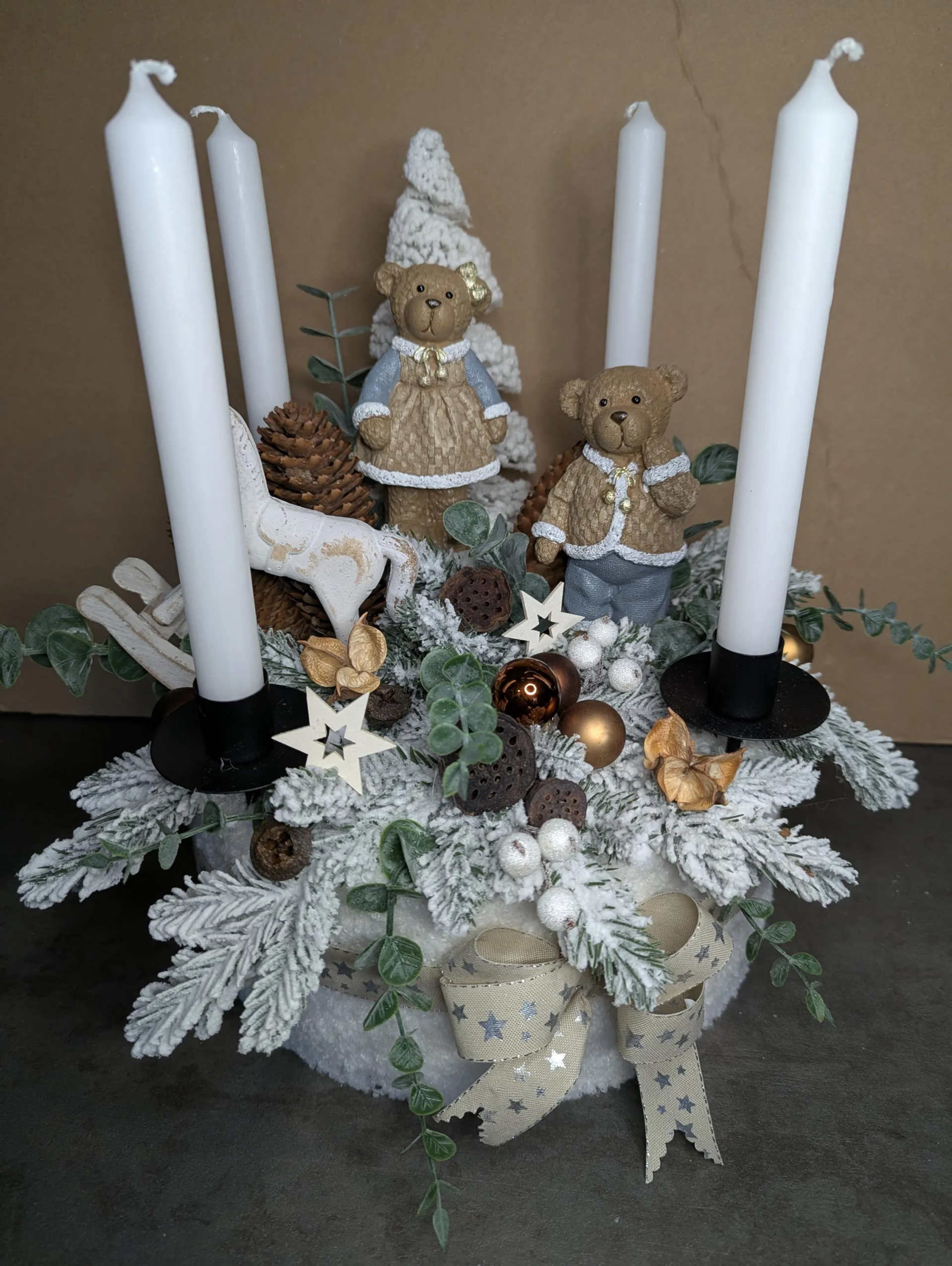 Couronne de l'Avent artisanale et unique, parfaite pour décorer votre intérieur durant les fêtes de fin d'année. Avec ces deux oursons, cet arrangement apporte une touche festive et chaleureuse.