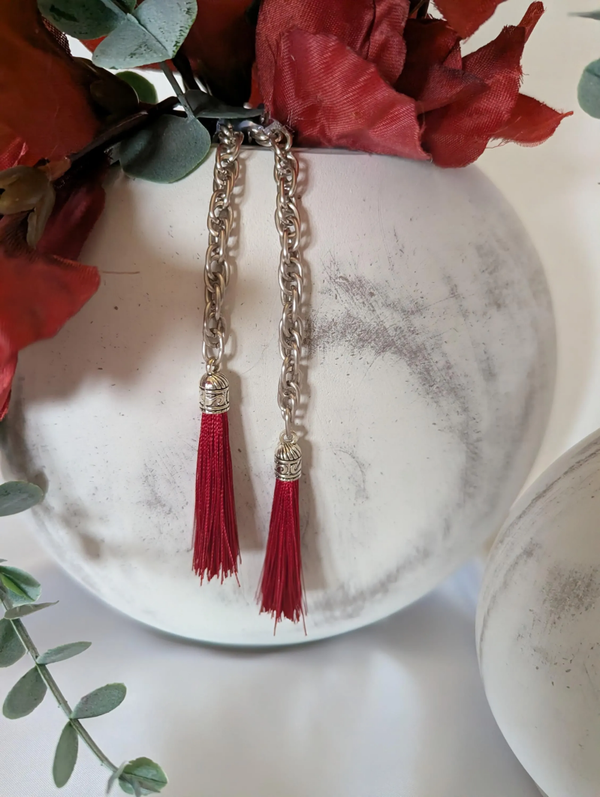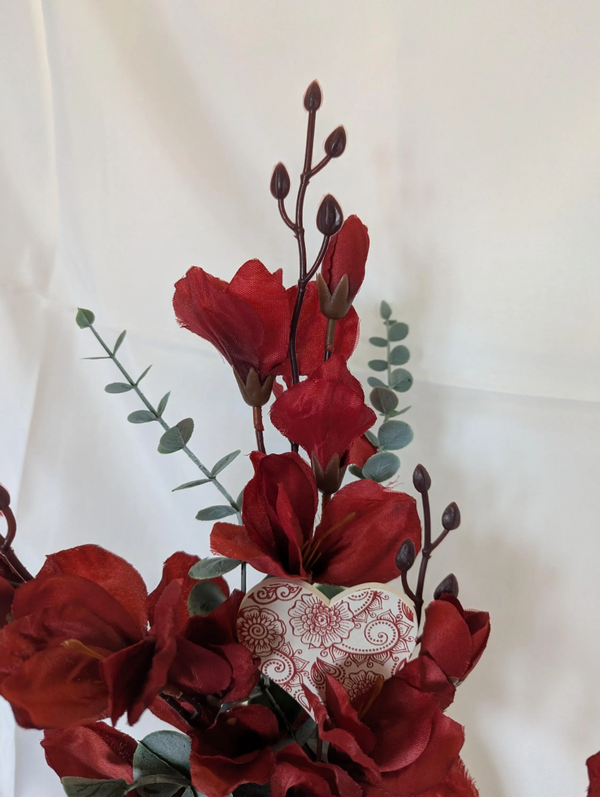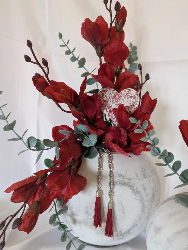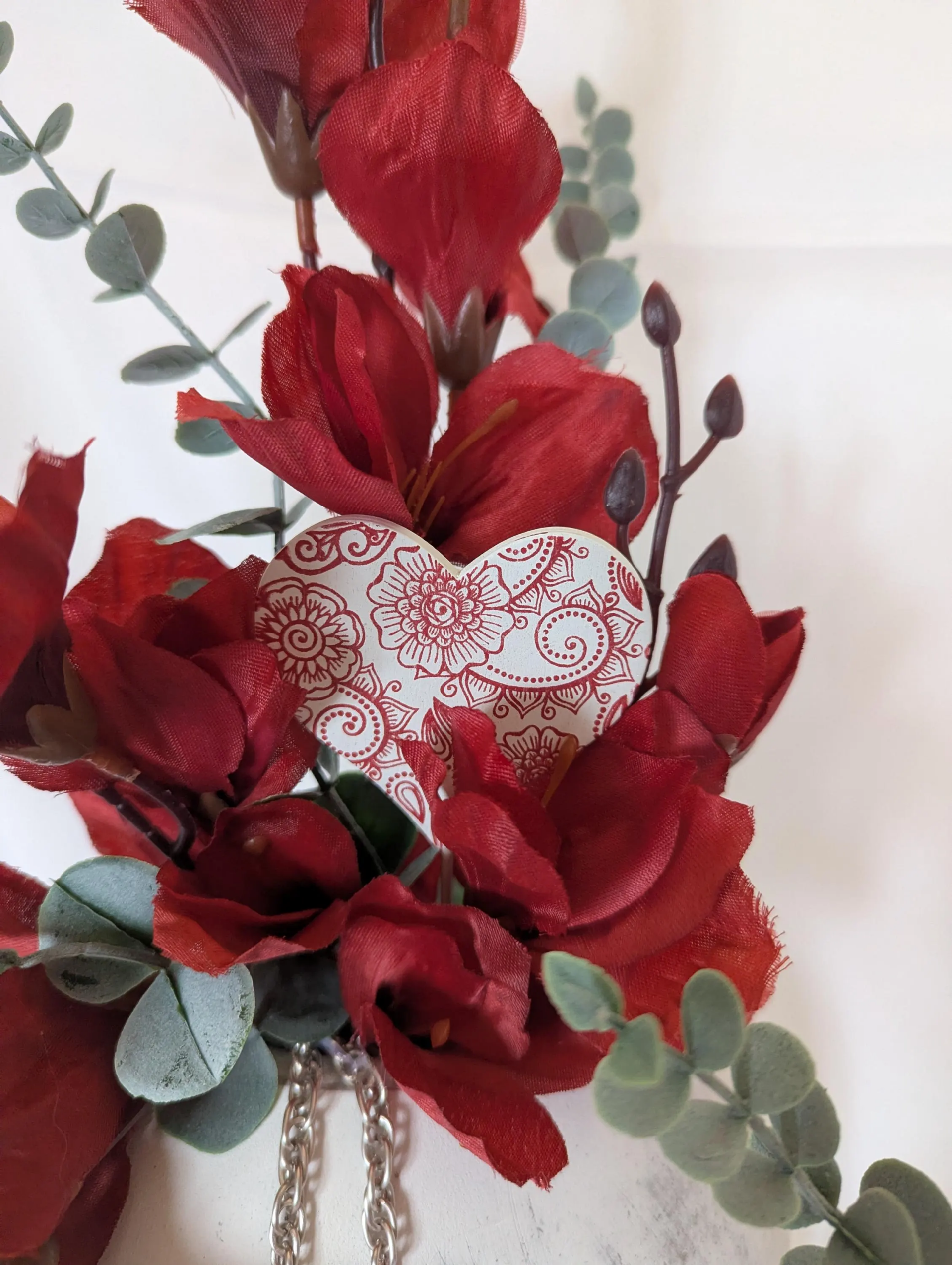 Joliment décoré de fleurs artificielles, d'eucalypthus, un cordon chainette avec deux pompons.