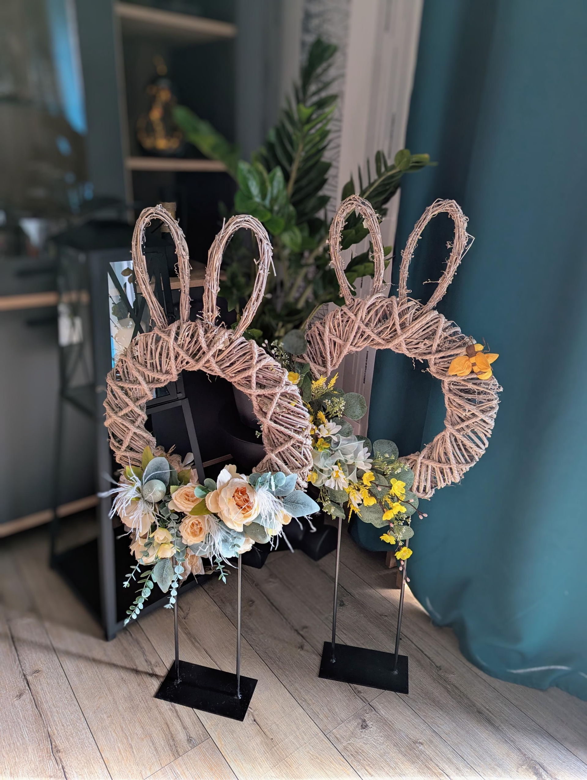 Une touche de nature alliée à un design moderne: la décoration de pâques " oreilles de lapin" associe du brin d'osier grisé, savamment enroulé autour d'une structure en métal noir, la couronne reste amovible et peu très bien être suspendue a une porte. ces jolie fleurs artificielle vous permettera de la resortir pendant plusieurs années.