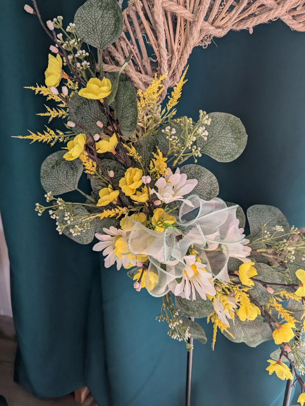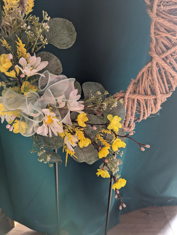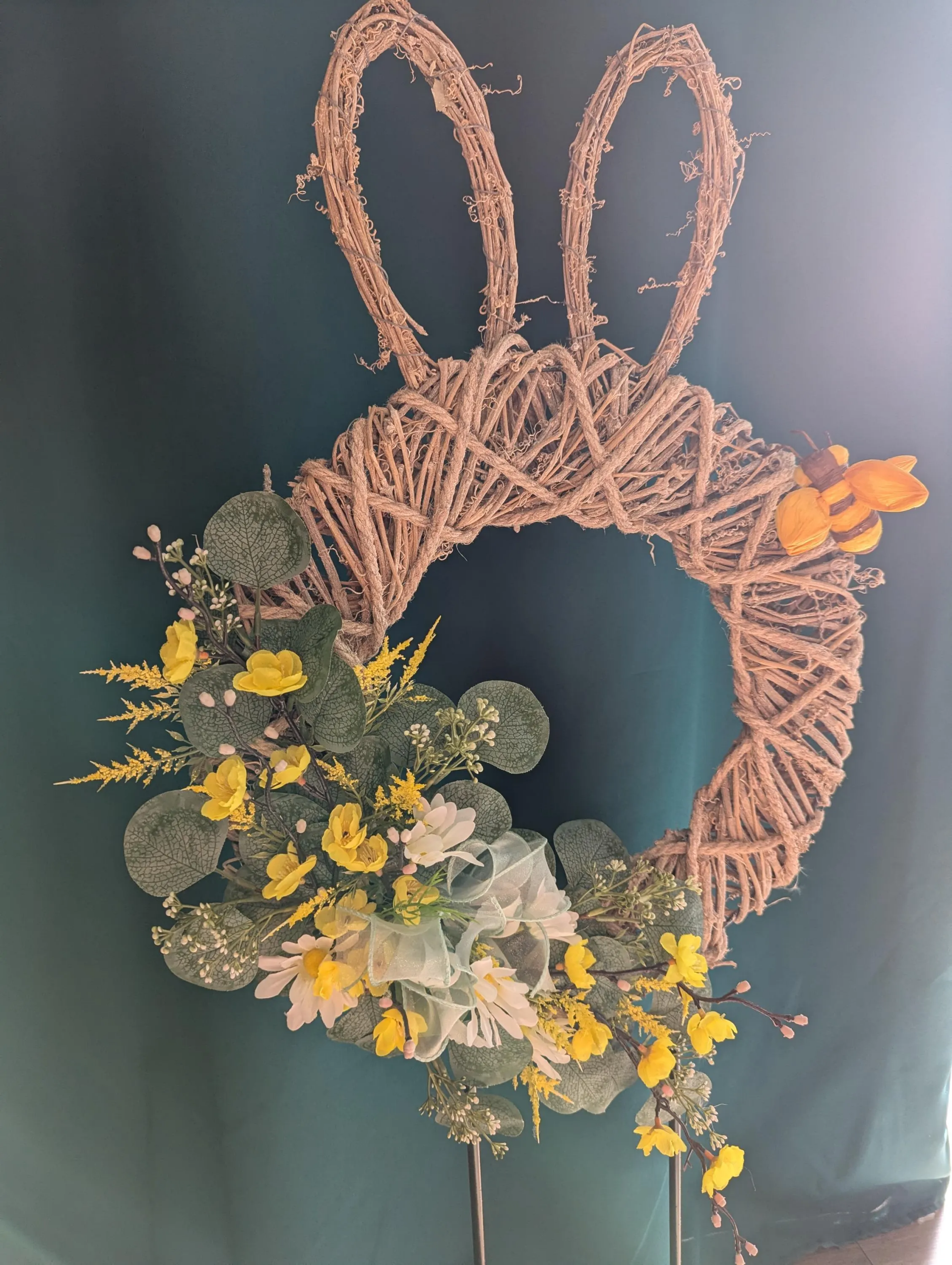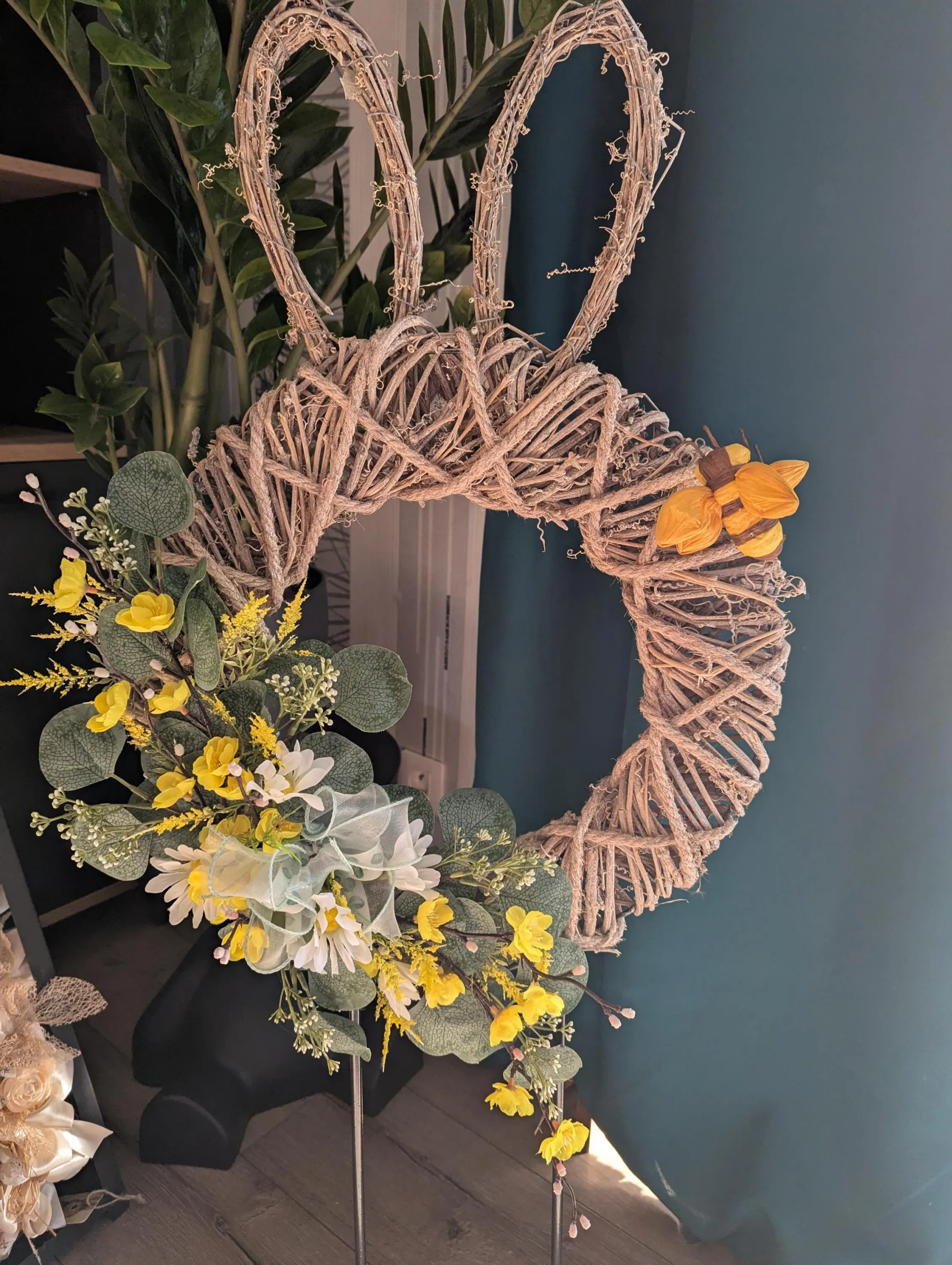 Une touche de nature alliée à un design moderne: la décoration de pâques " oreilles de lapin" associe du brin d'osier grisé, savamment enroulé autour d'une structure en métal noir, la couronne reste amovible et peu très bien être suspendue à une porte. Ces jolie fleurs artificielles vous permetteront de la resortir pendant plusieurs années.