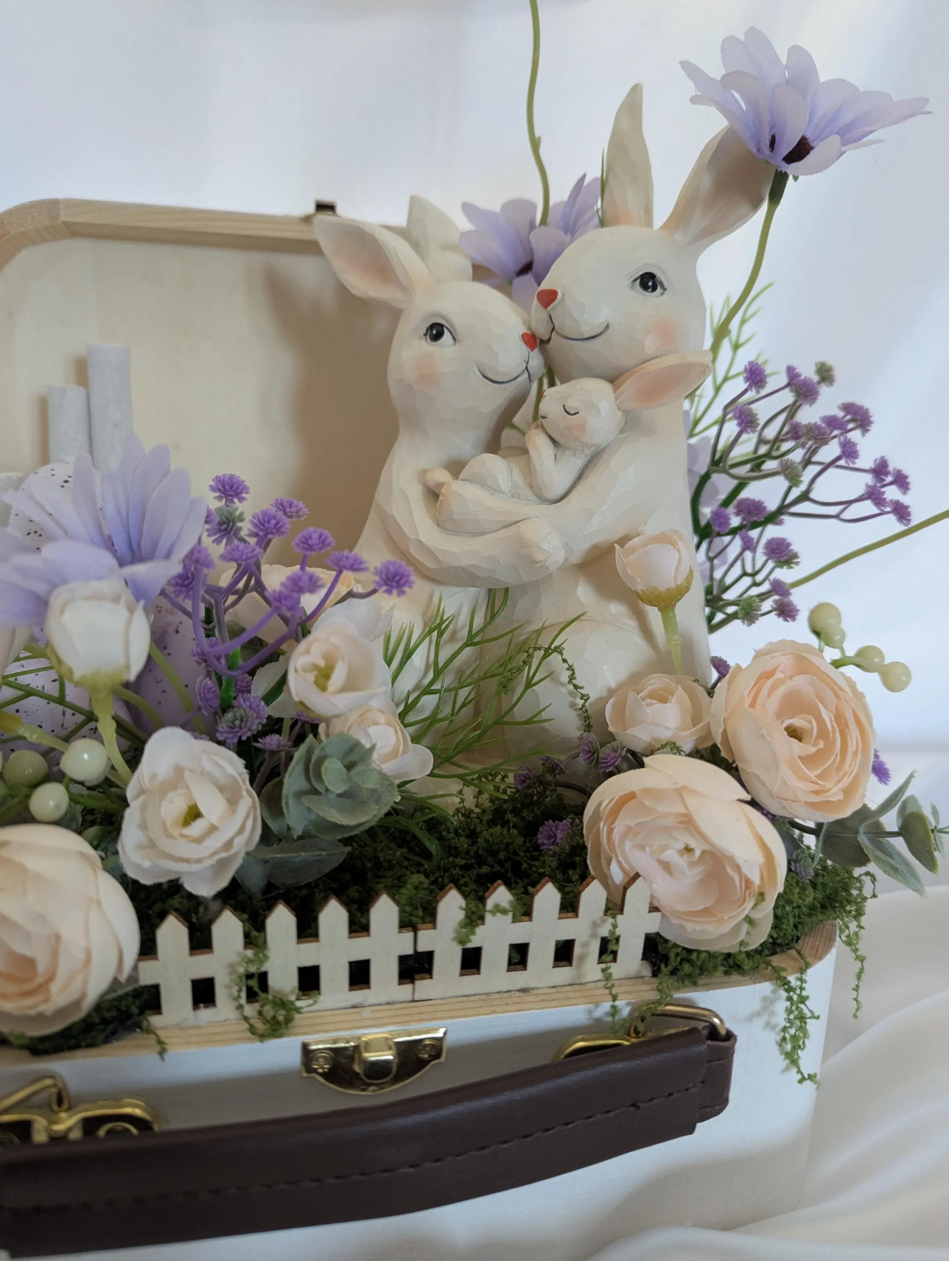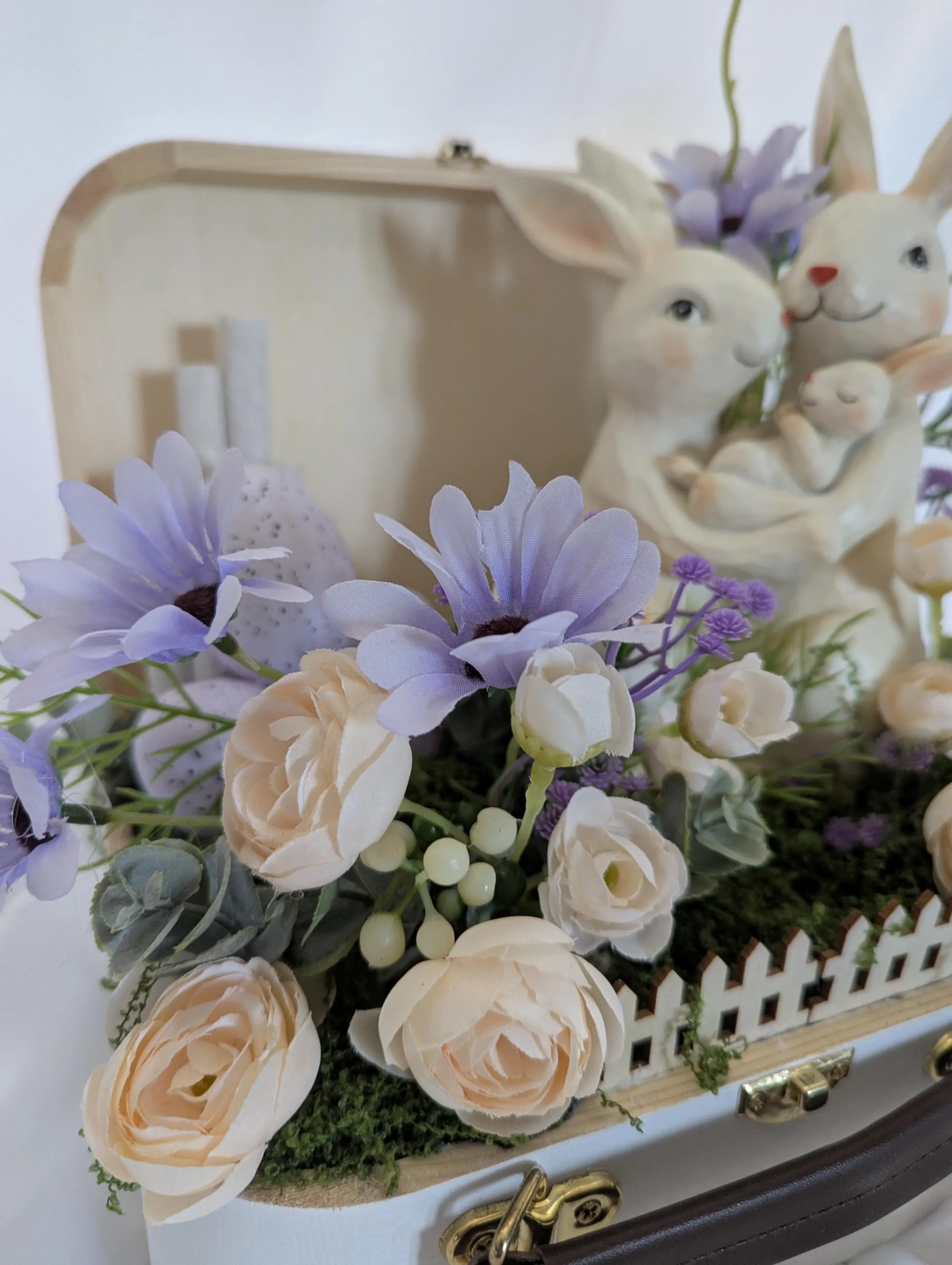 Une touche de nature alliée à un design moderne: la décoration de pâques associe une valisette en bois et des lapins attendrissants ces jolie fleurs artificielle vous permettera de la resortir pendant plusieurs années. Cette décoration est composée d'une valisette en bois, fleurs artificielles, barière en bois, des oeufs artificielle de batonnées en bois blanc de lapins en polyrésine.