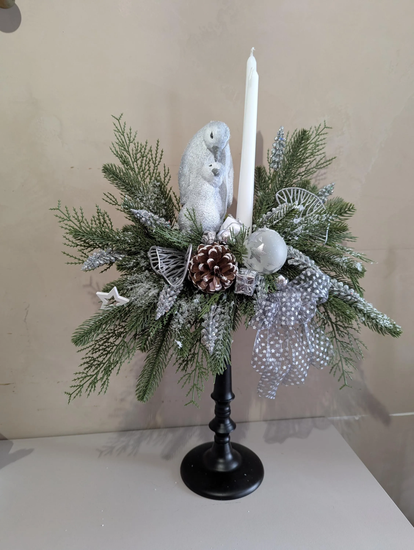 Elle se compose d'un bougeoir en métal noir, orné de sapin artificiel, de boules de Noël, de pommes de pin, d'un ruban gris avec des étoiles blanches, de cadeaux gris et blancs, d'une étoile blanche, de pingouins en polyrésine et de décorations grises, ainsi que de deux supports avec leurs bougies. Dimensions : environ 40 cm de long et 59 cm de haut.