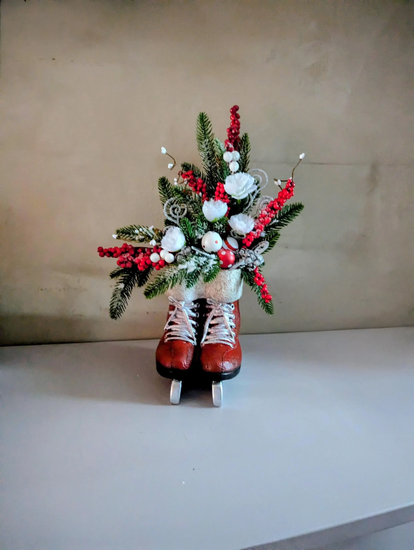 Cette décoration, réalisée dans une paire de patins à glace rouges, est composée de sapin artificiel, de boules de Noël, de diverses décorations en bois, de baies rouges, de fleurs blanches et de branches avec des baies blanches. Ses dimensions sont d'environ 28 cm de largeur et 42 cm de hauteur.