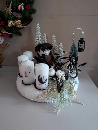 Elle est constituée d'une couronne en fourrure faite main, d'un pousse-pousse miniature orné de boules de Noël, de sapins artificiels, de baies blanches, de pommes blanches, de petites fleurs pompons noires, de feuillage doré, d'une lanterne noire à LED, ainsi que de quatre supports à bougies avec leurs bougies blanches décorées. Dimensions : environ 32 cm de longueur et 30 cm de hauteur.