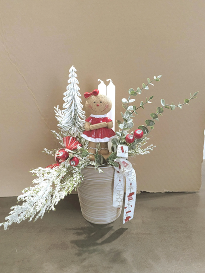 Elle se compose d'un pot en céramique décorée de boules de Noël, d'un sapin artificiel, de baies rouges artificielles,d'un noeux rouge, d'eucalyptus, d'une fille en biscuit en polyrésine, ainsi que de 2 supports à bougies et bougies. Dimensions : environ 25 cm de longueur et 36 cm de hauteur.